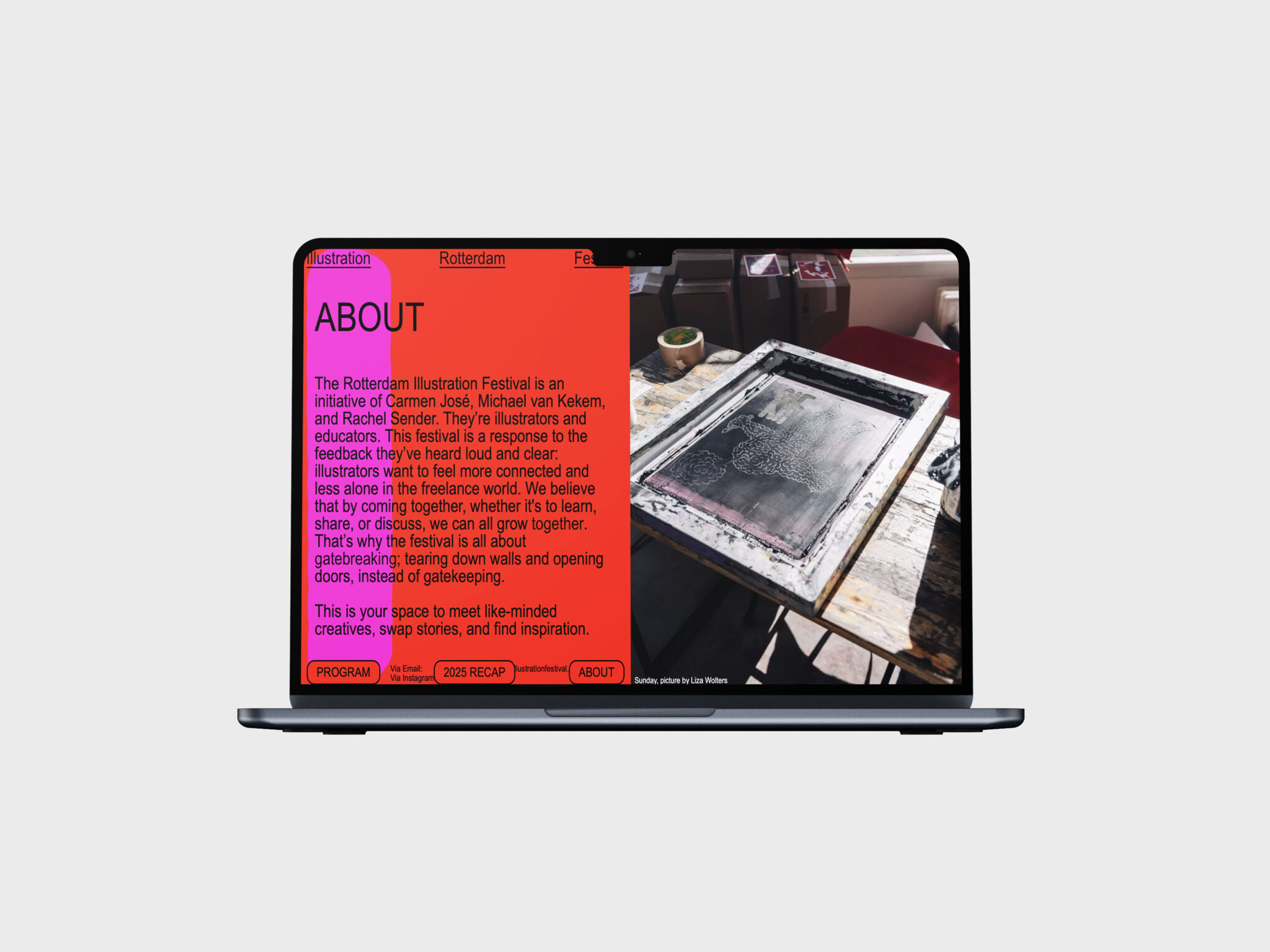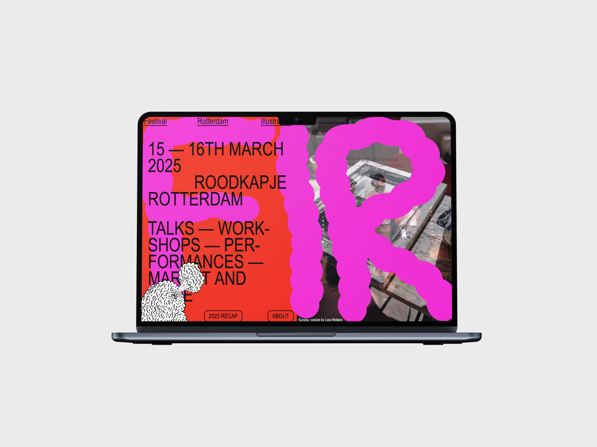 RIF Client Rotterdam Illustration Festival Date 15-16 March 2025 Initiative Rachel Sender, Carmen José and Michael van Kekem Website Bureau Sporken Identity Koehorst in ’t Veld Mascot Illustrations Johan Kleinjan Photo Klarka Batek Photo Klarka Batek Photo Rachel Sender